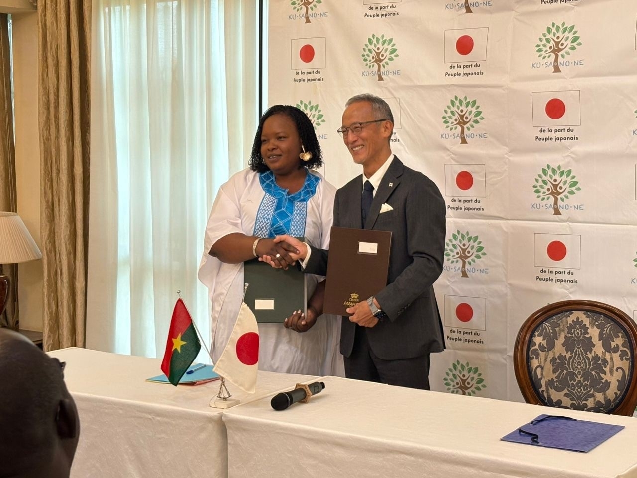 Le 23 janvier, l’Ambassadeur NAGASHIMA Jun et Mme. LALLOGO Véronique, Chargée du projet de l’Association Pour la Promotion Féminine au Burkina, ont procédé à la signature d’un contrat de don pour la réalisation du Projet de Réalisation des Châteaux d’Eau dans la Commune Rurale de Tanghin D’Assouri, Province du Kadiogo.
