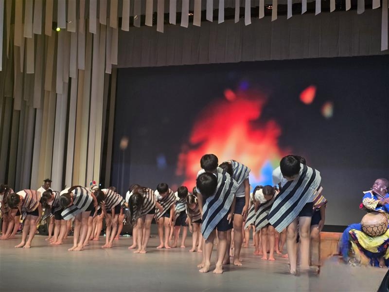 パフォーマンスには内閣官房の万博国際交流プログラムに選出された橿原市の小学生70人が参加しました。子どもたちはブルキナファソの民族衣装をモチーフにした衣装で歌や楽器の演奏に合わせて踊り、舞台を盛り上げました。